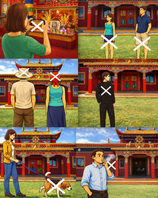 La visite débutera à l’intérieur du temple, où vous découvrirez son atmosphère unique et ses trésors symboliques. Ensuite, un pratiquant vous guidera à l’extérieur pour vous faire découvrir le symbolisme des différents supports sacrés, tels que le « Tsakang » (reliquaire sacré) et la maison des lumières.