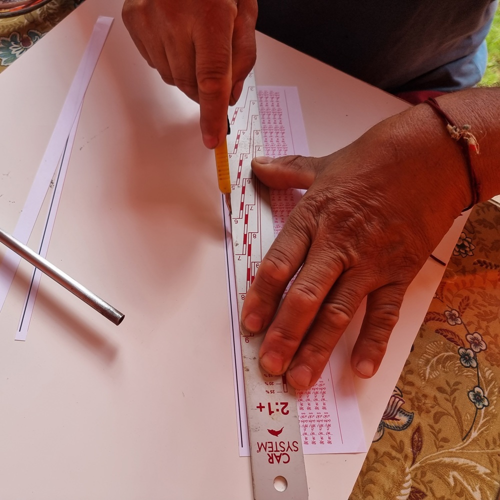 Une fois les feuilles imprimées, on procède au découpage des bandes de mantras. C’est un travail très méticuleux, qui demande beaucoup de soin et d’attention.