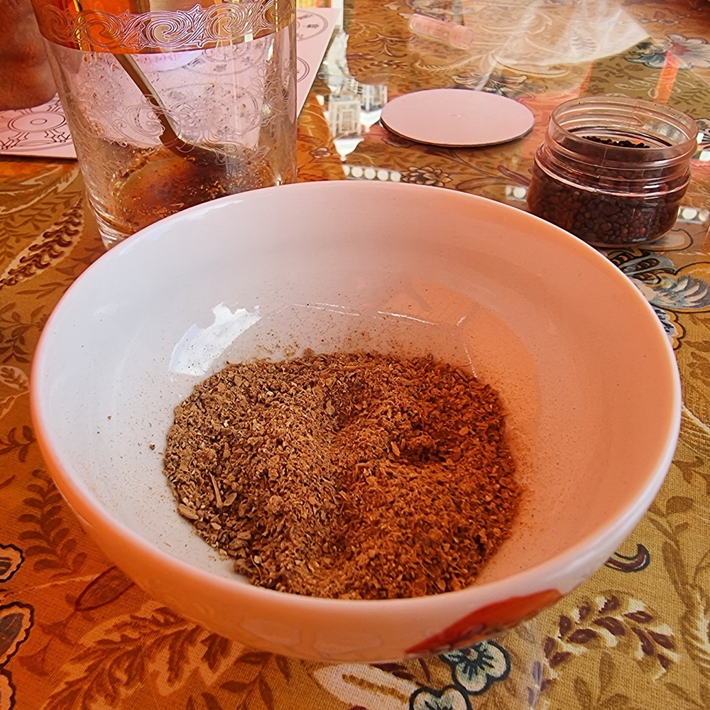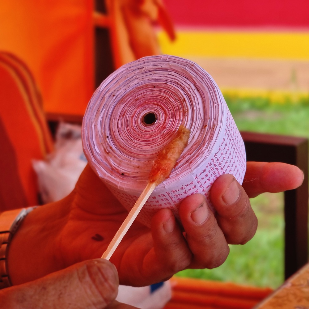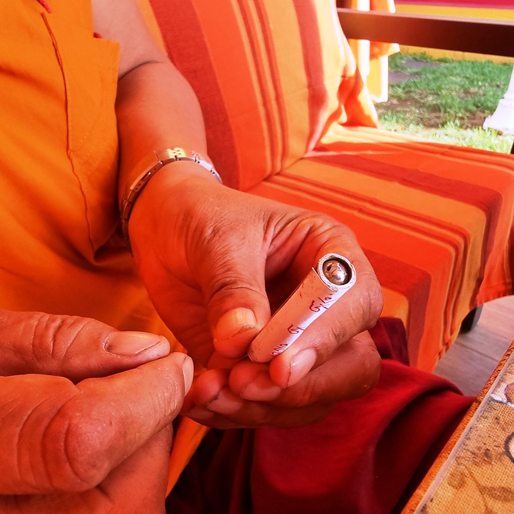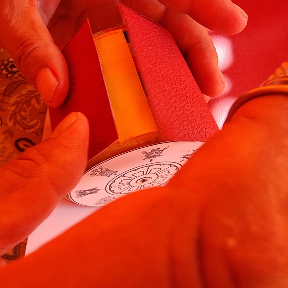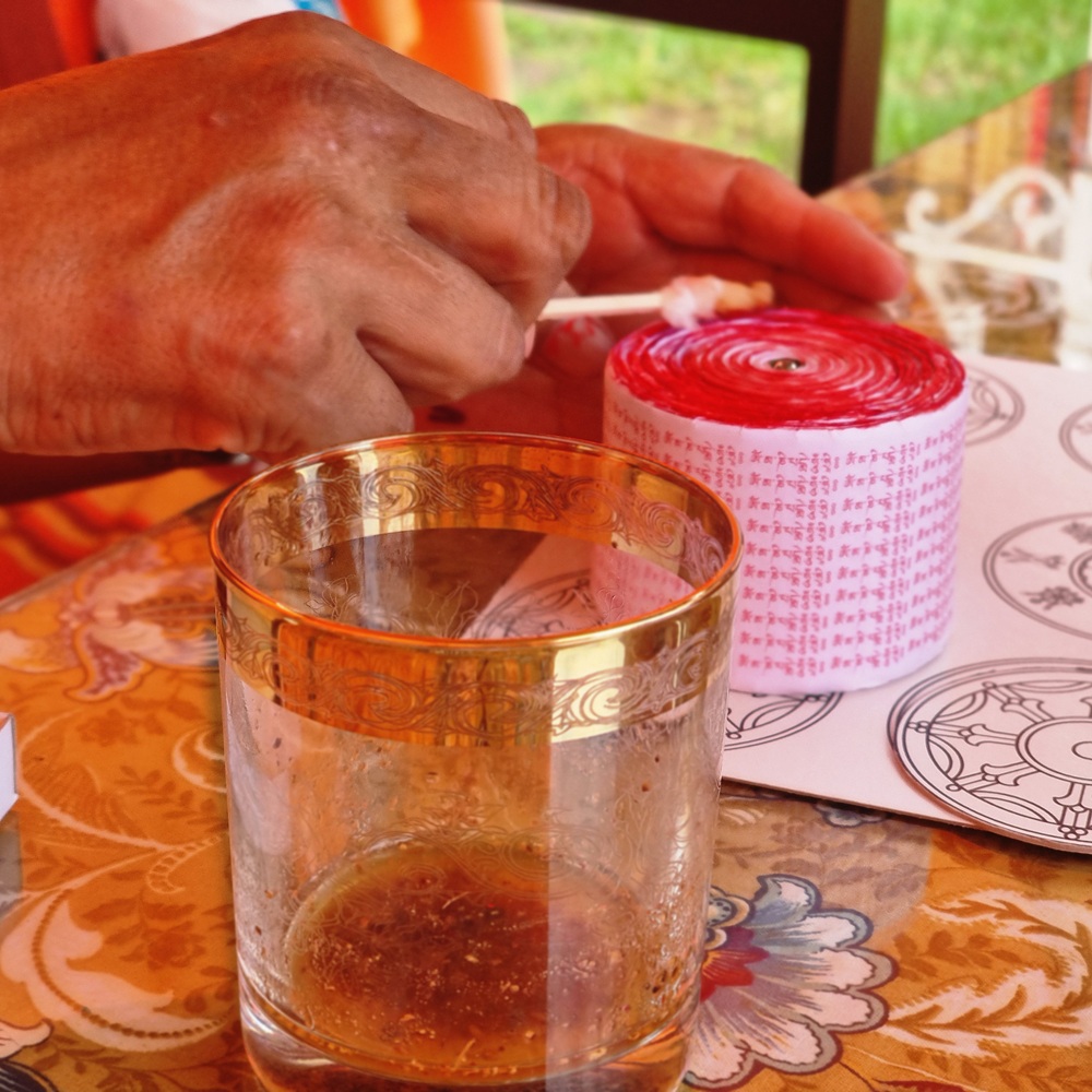 On procède ensuite à la bénédiction de la bobine de mantras. On prépare un mélange constitué de poudre purifiante (zangdrouk) ainsi que de pilules de bénédiction, contenant des reliques de bouddhas et de grands maîtres. On ajoute un peu d’eau légèrement tiède afin d’obtenir un mélange fluide. Ce mélange est placé dans un récipient propre, en bon état (non ébréché). À l’aide d’un pinceau ou d’un morceau de coton, on applique légèrement ce mélange sur le sommet, puis sur le bas de la bobine. Il n’est pas nécessaire d’imbiber la bobine dans son ensemble. La bénédiction est avant tout symbolique : elle pénètre immédiatement le support, sans qu’il soit besoin de mouiller abondamment. Une fois cette étape terminée, on laisse la bobine sécher avant de passer à l’habillage.