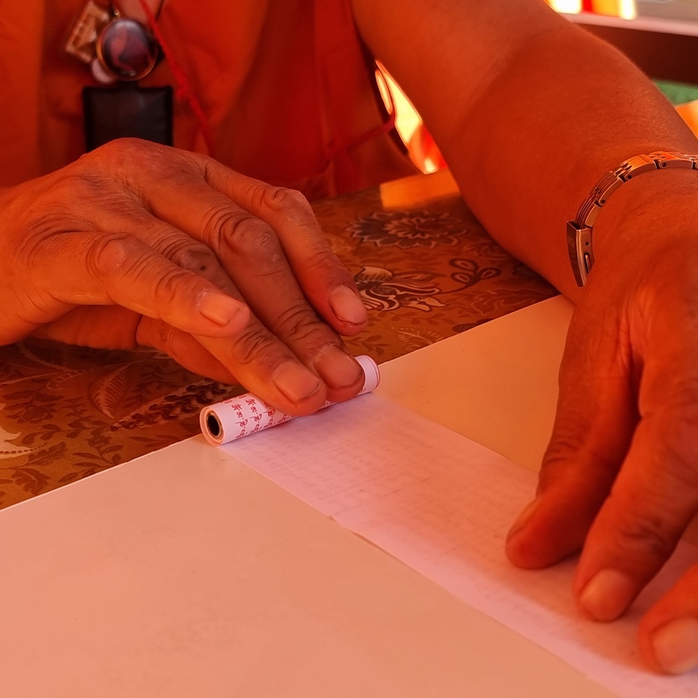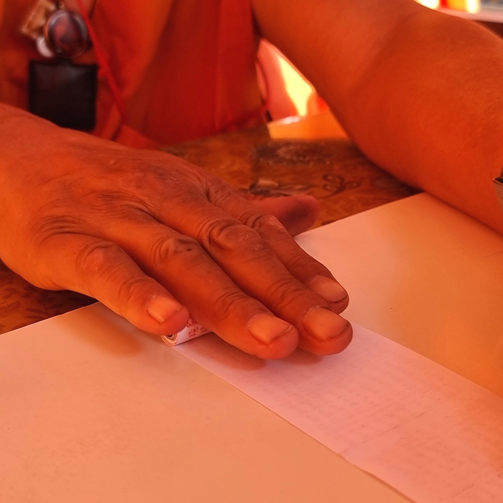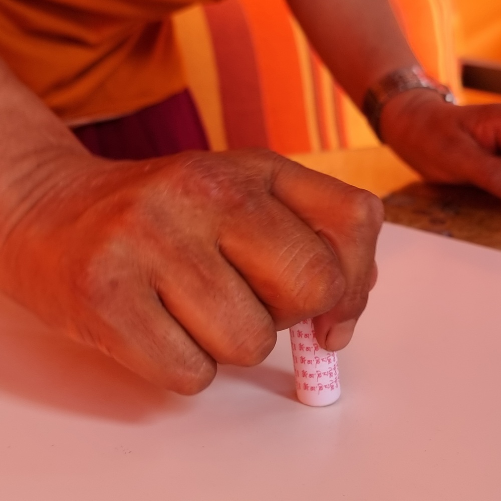 - l’autre tient et guide la bande de mantras, en maintenant une tension régulière et en donnant le bon sens au papier.
