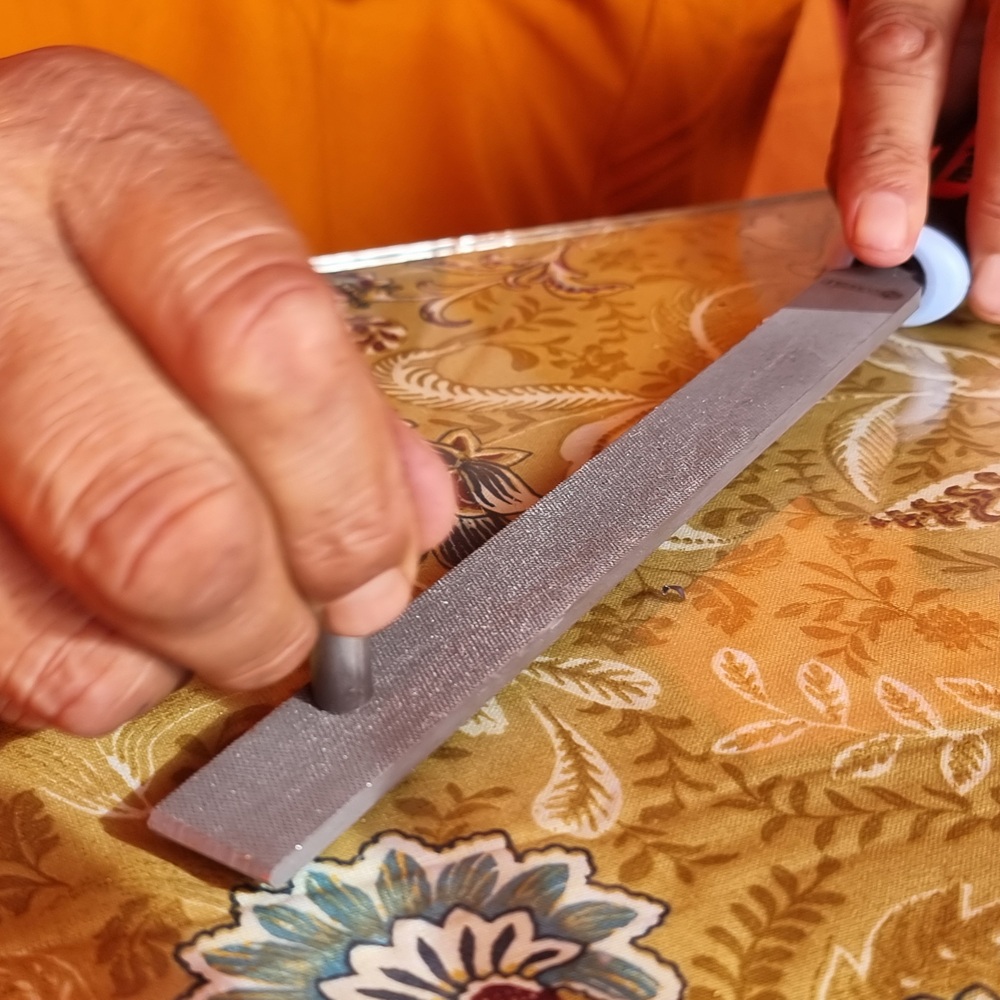 Le support sur lequel on découpe doit être propre, afin de ne pas salir ou abîmer les mantras. On peut utiliser : un cutter, des ciseaux, ou un massicot, selon ce dont on dispose.
