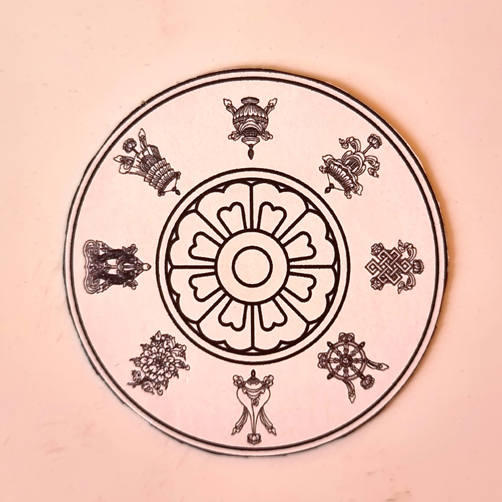 Le mandala de la base représente la terre et est appelé Sa Padma Tabgyet, ce qui signifie « le lotus aux huit pétales ». Il symbolise les huit qualités auspicieuses.