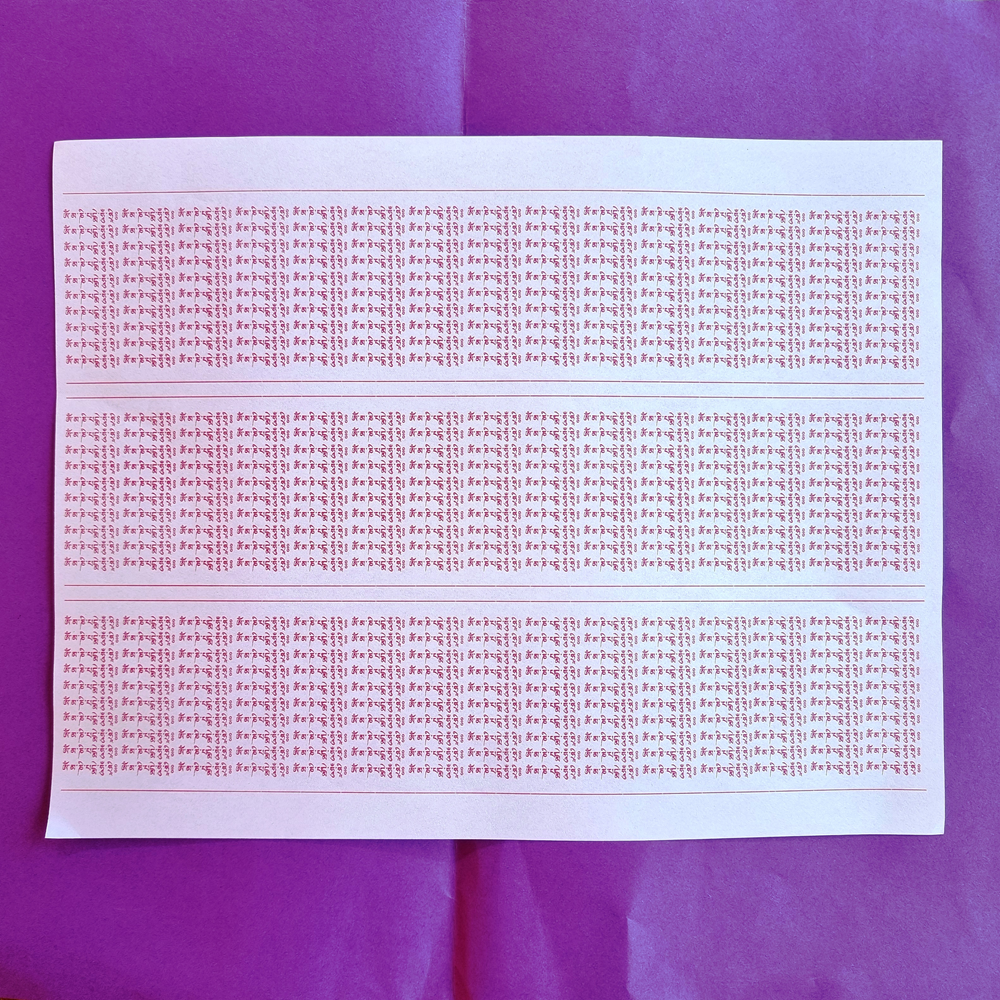 En haut et en bas de chaque bande, on trace une ligne rouge, qui servira de repère pour la découpe. L’espace supérieur et inférieur entre la ligne et le mantra doit être identique, afin d’obtenir des bandes régulières et bien alignées.