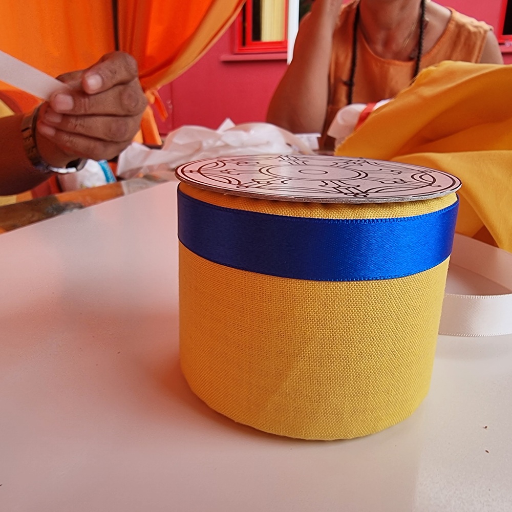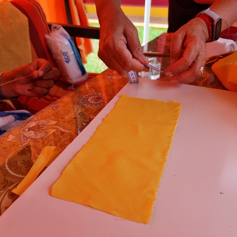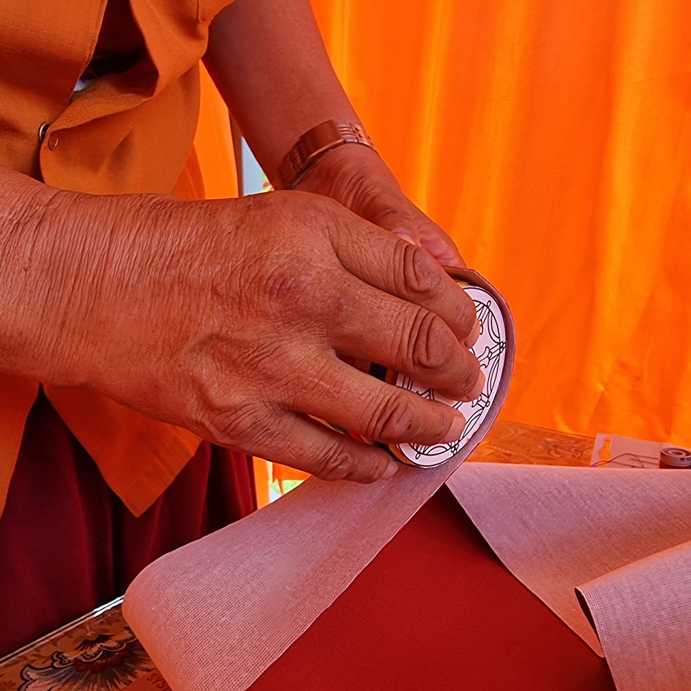 On prépare ensuite une bande de tissu jaune, que l’on coud pour former un cylindre. Cette bande constitue le premier vêtement de la bobine. Avant d’enfiler le tissu, on repère soigneusement le départ du mantra, la syllabe OM. La couture du tissu doit être alignée exactement sur ce point. Le tissu est ensuite ajusté progressivement autour de la bobine.