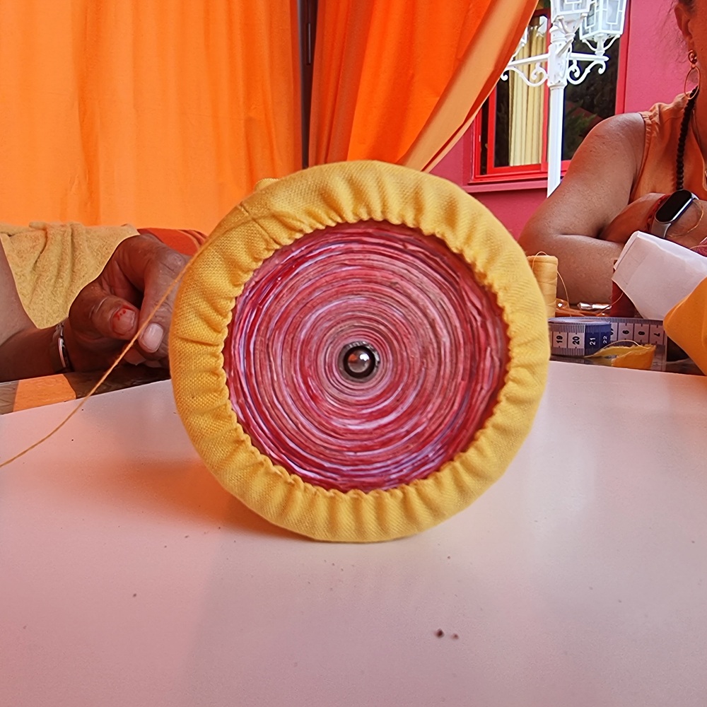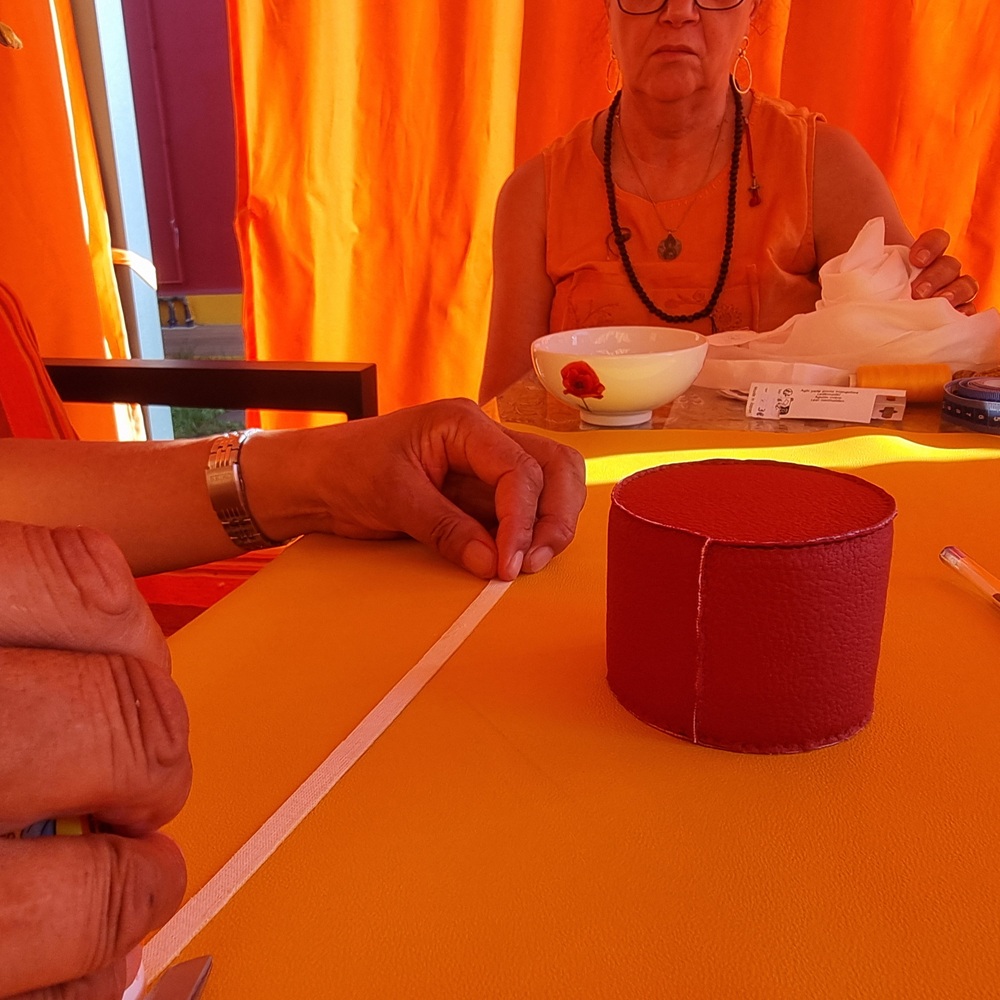 On prépare deux mandalas ronds, de la même superficie que la bobine, qui seront placés sur les deux extrémités de la bobine et cousus à l’intérieur de l’habillage.