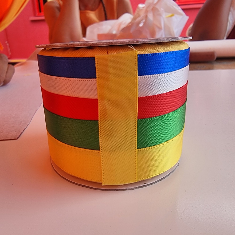 Une fois le tissu jaune cousu, on découpe cinq bandes de cinq couleurs. Elles sont collées dans l’ordre suivant : bleu (espace), blanc, rouge, vert, jaune (terre, en dernier). Ces bandes sont une offrande supplémentaire et correspondent aux cinq activités éveillées. On commence toujours à partir du même axe, correspondant au départ du mantra.