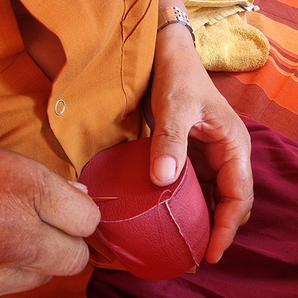 On ferme d’abord la partie supérieure, puis la partie inferieure, en veillant à utiliser la même méthode de couture, et toujours en respectant l’axe du départ du mantra.