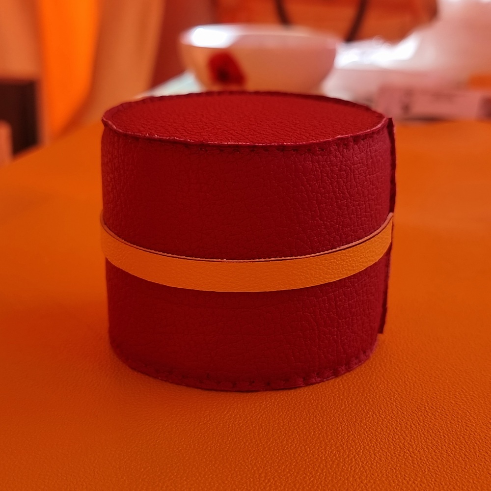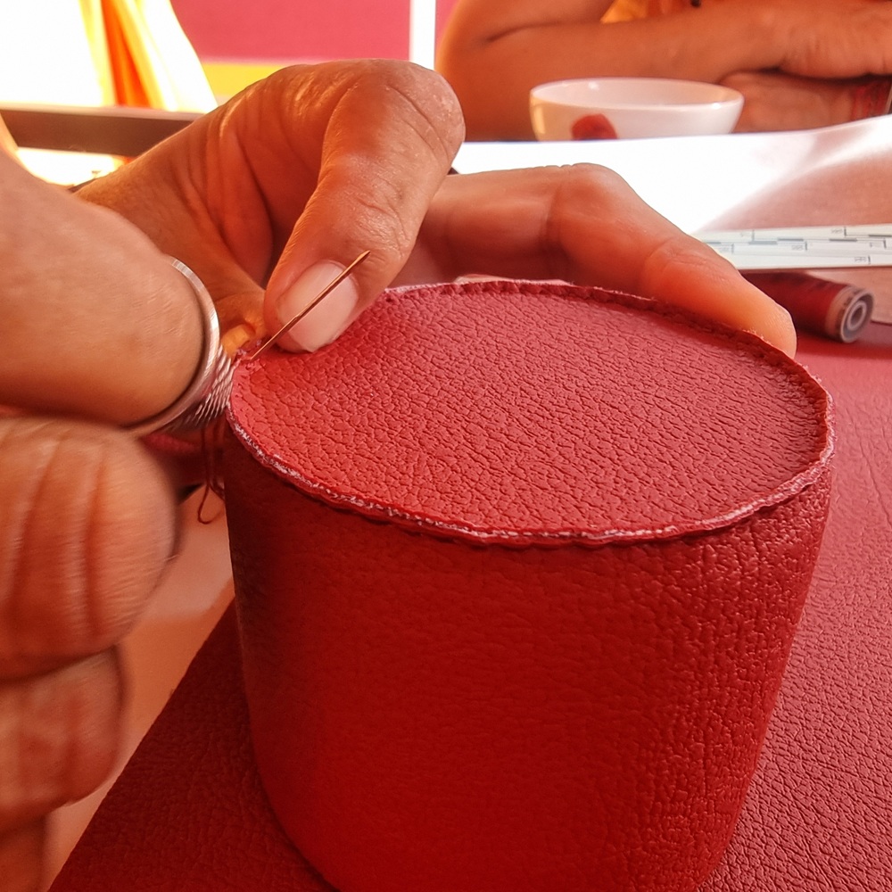 On procède ensuite à l’habillage extérieur en sky (cuir rouge foncé). On mesure précisément la hauteur de la bobine, puis on découpe : une bande centrale correspondant exactement à cette hauteur, deux ronds pour le haut et le bas. Les ronds ne doivent pas être trop grands, afin que l’habillage ne bâille pas. La bande de sky est cousue sur elle-même, toujours en respectant le même point de départ (OM).